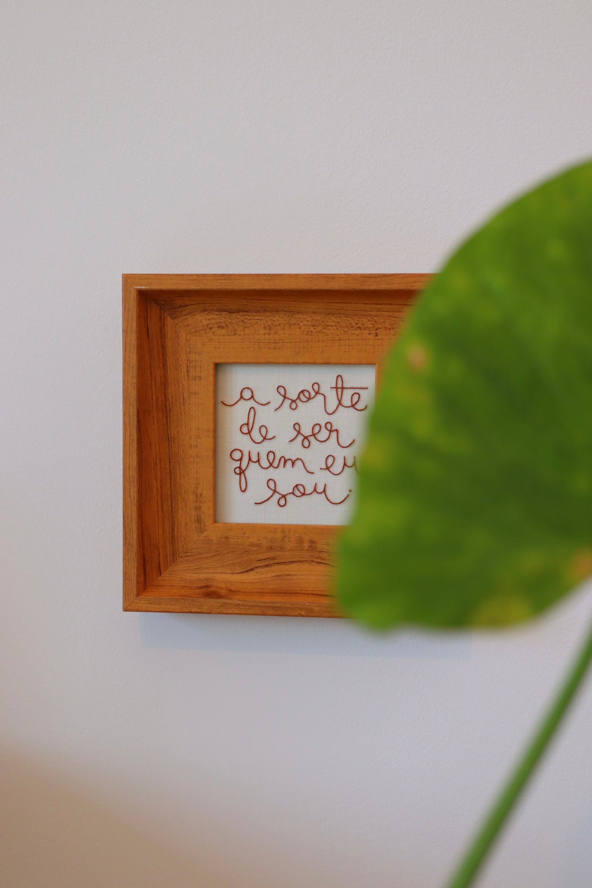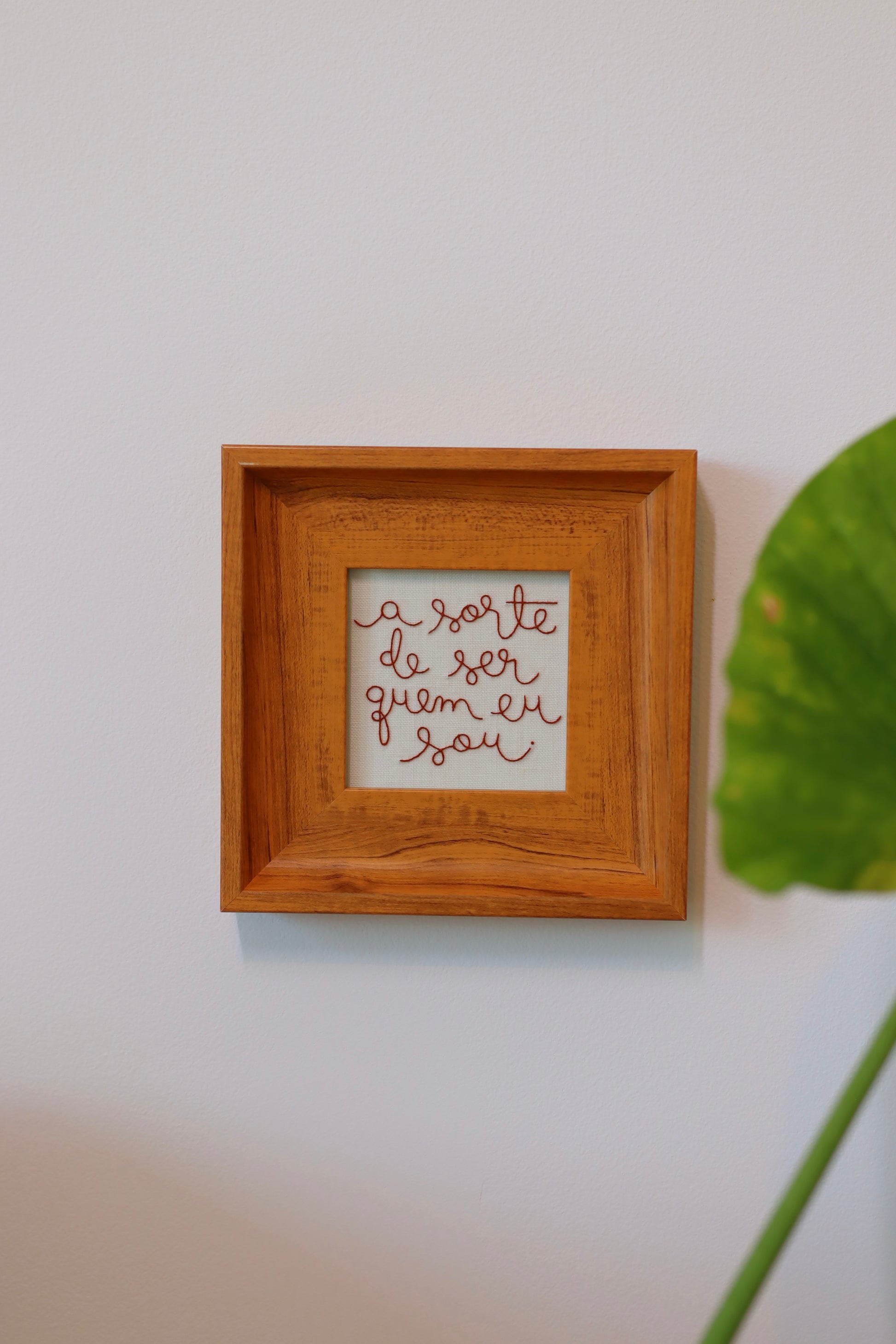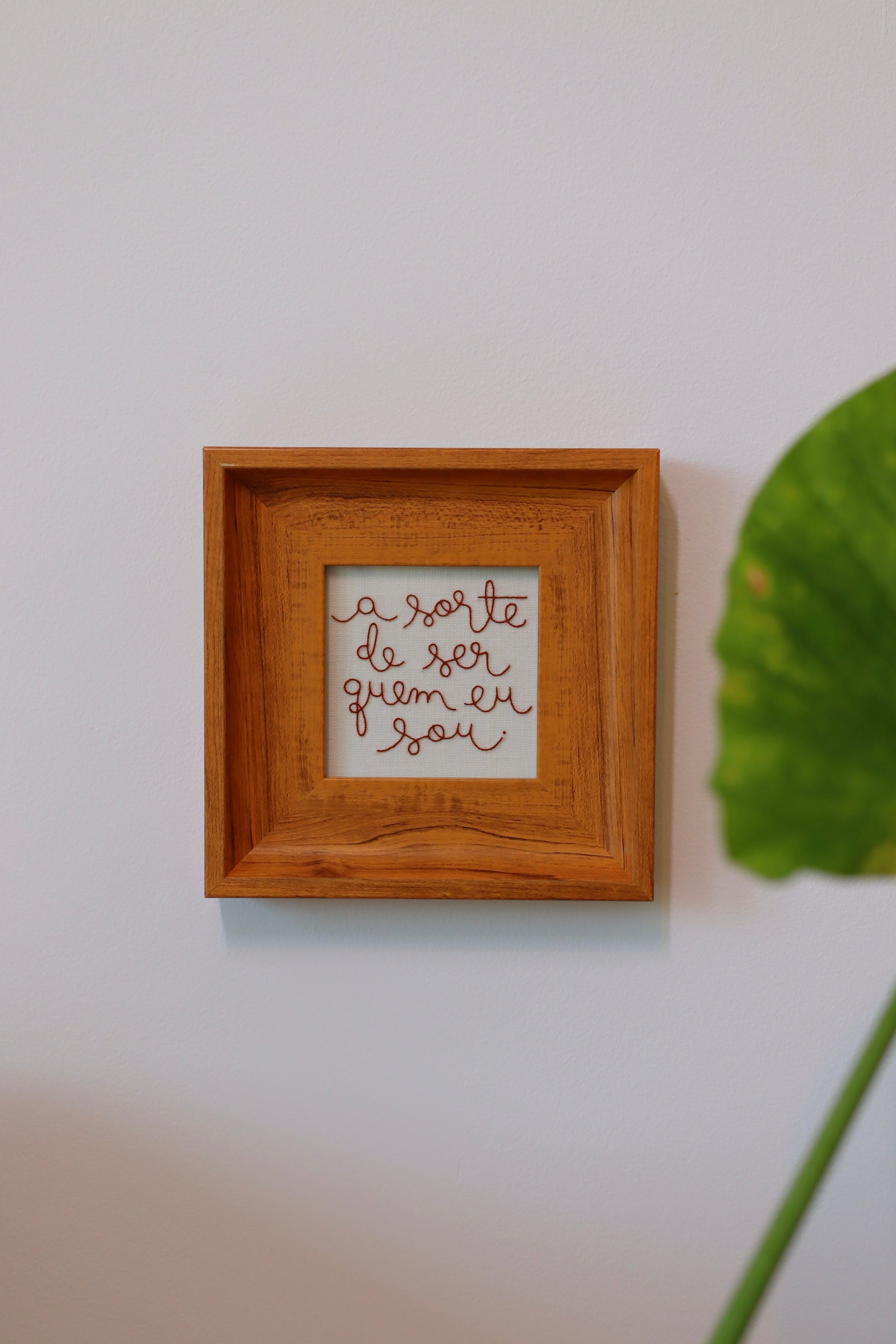Quadro bordado à mão com a frase 'A sorte de ser quem eu sou', com caligrafia exclusiva de Natália Marinho, utilizando linha francesa sobre tecido de linho puro.