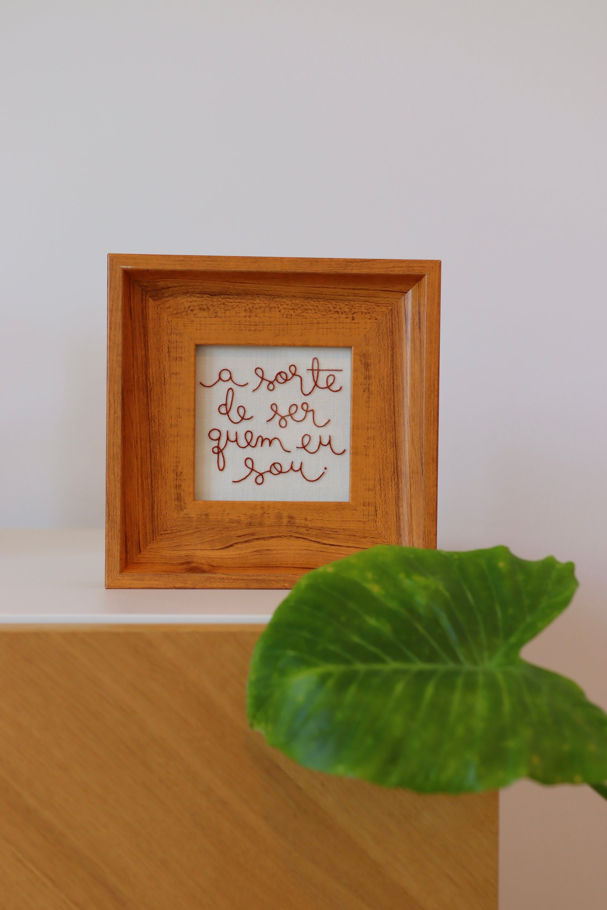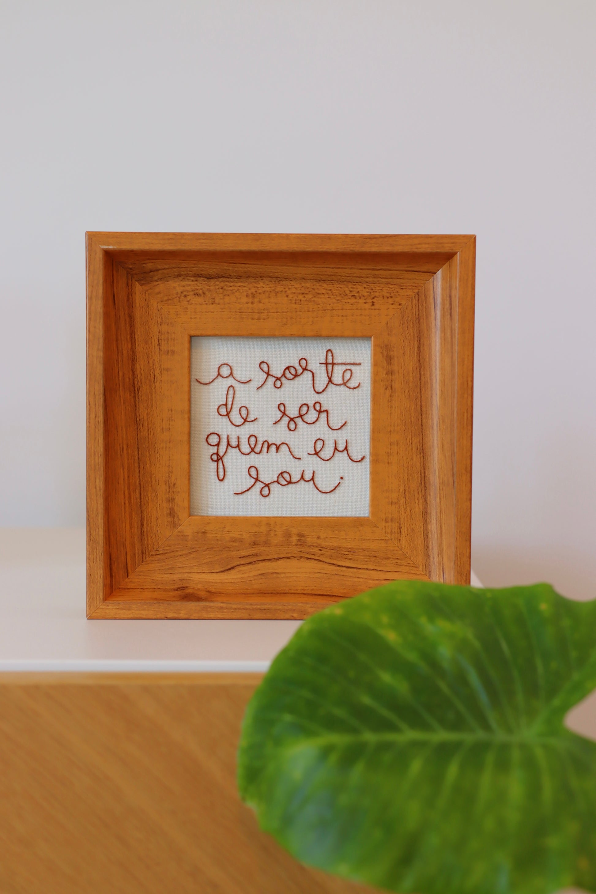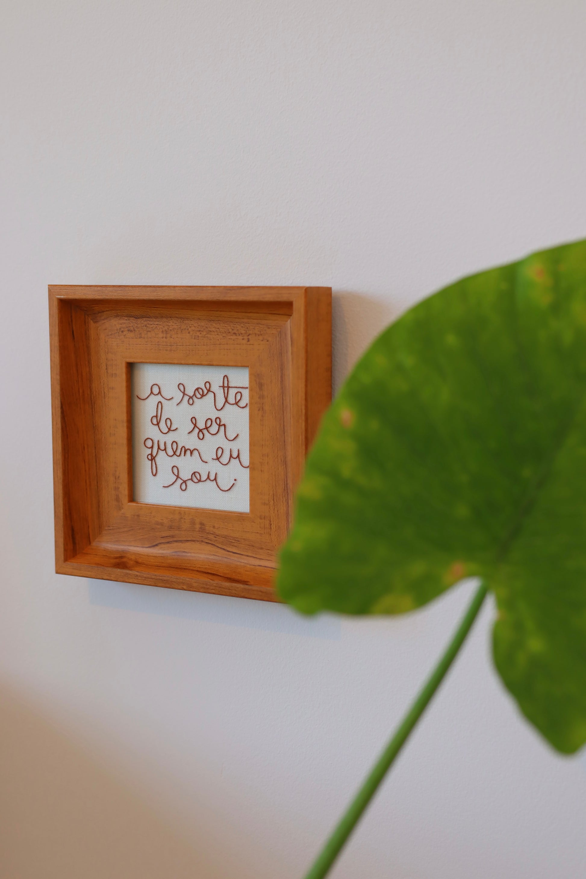 Quadro bordado à mão com a frase 'A sorte de ser quem eu sou', com caligrafia exclusiva de Natália Marinho, utilizando linha francesa sobre tecido de linho puro.