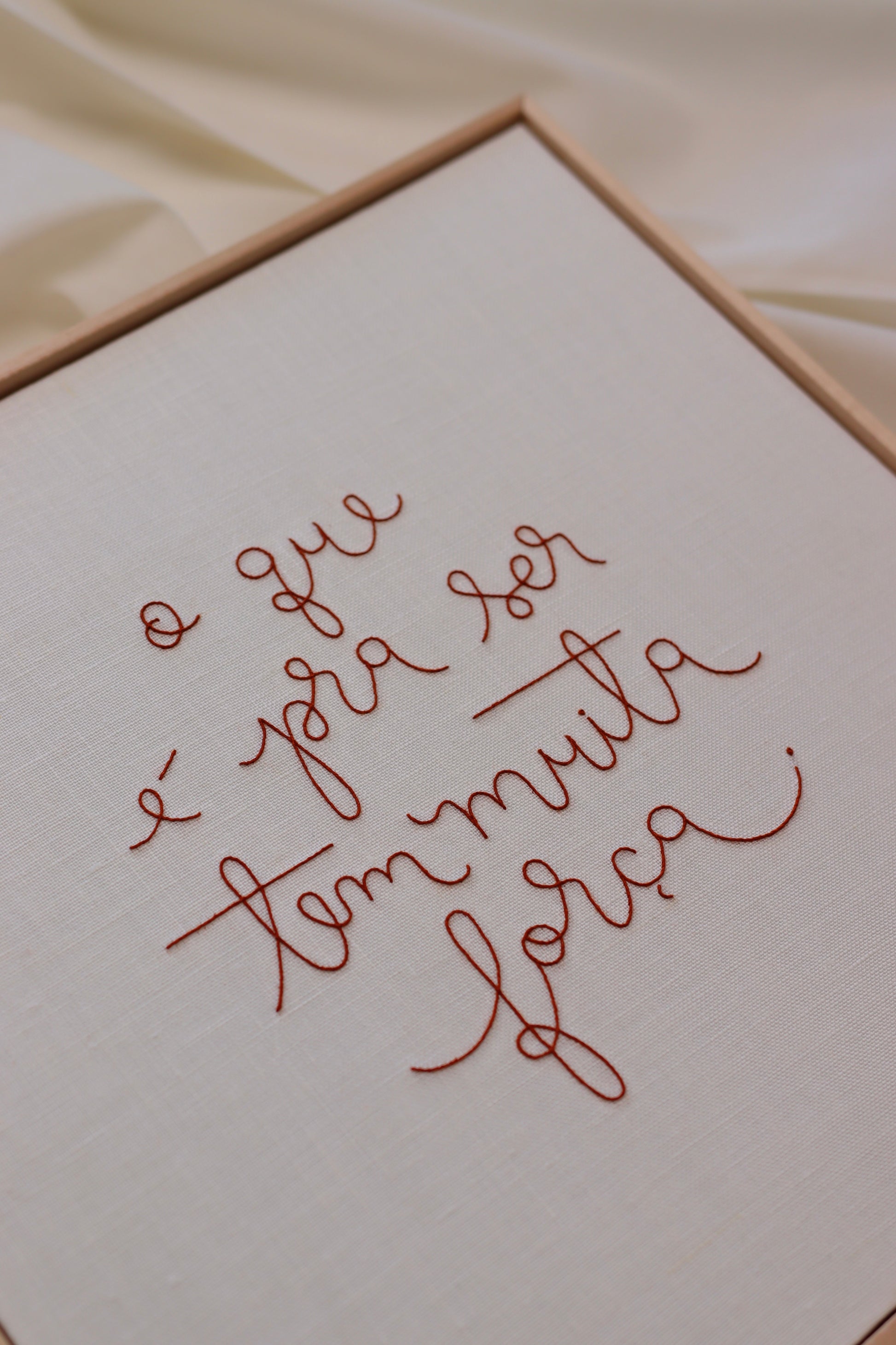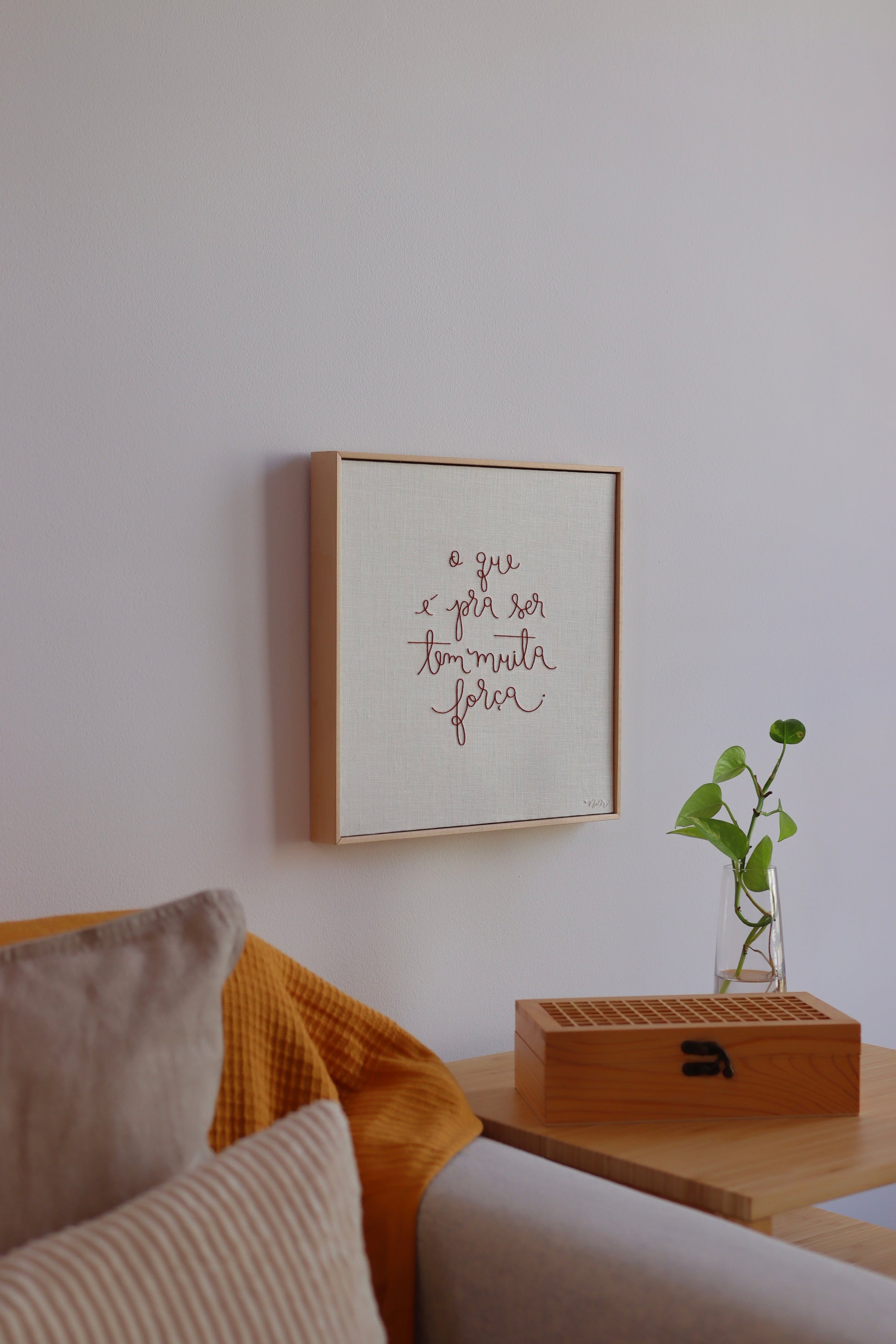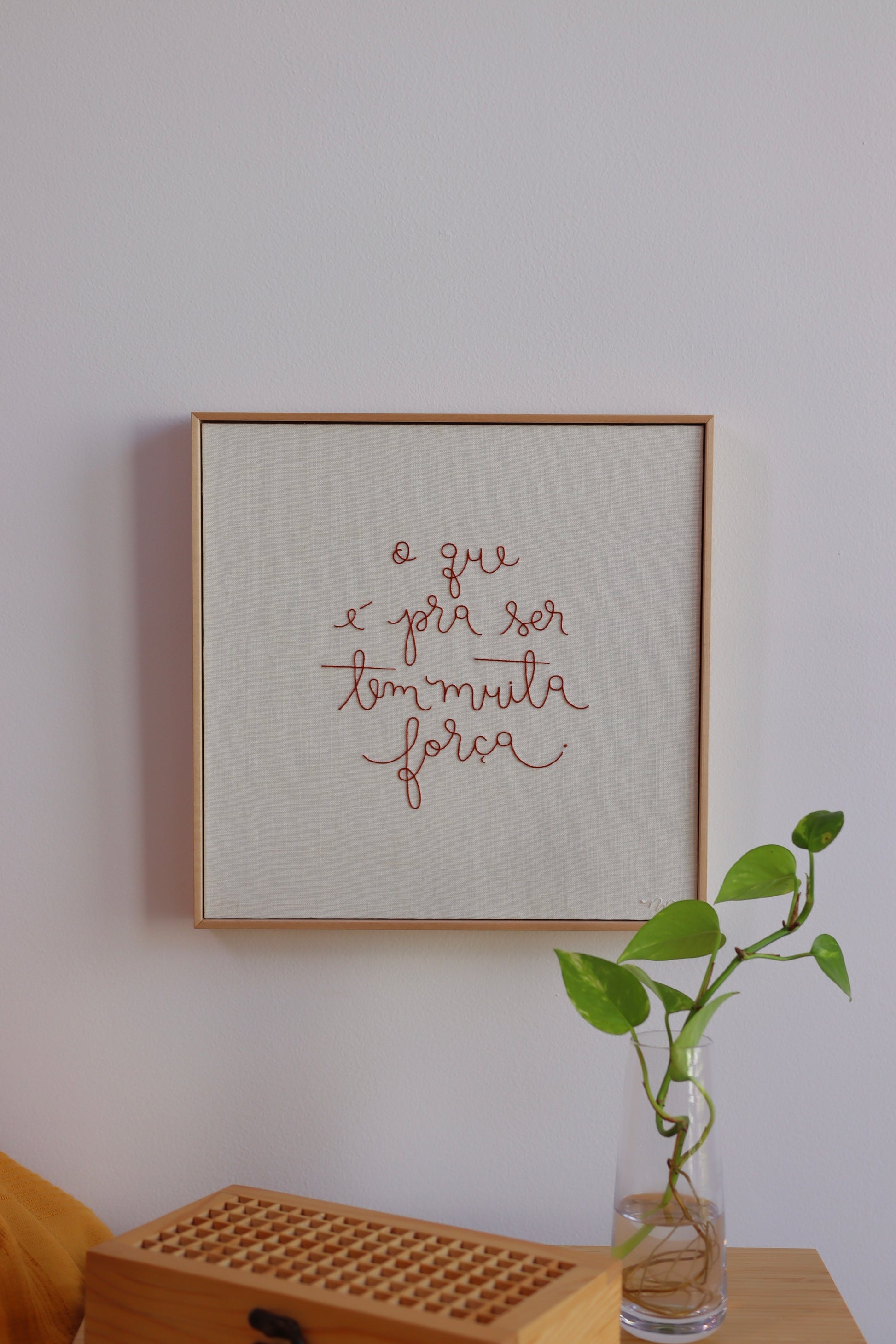 Quadro bordado à mão com a frase 'O que é pra ser tem muita força', com caligrafia exclusiva de Natália Marinho, utilizando linha francesa sobre tecido de linho puro.