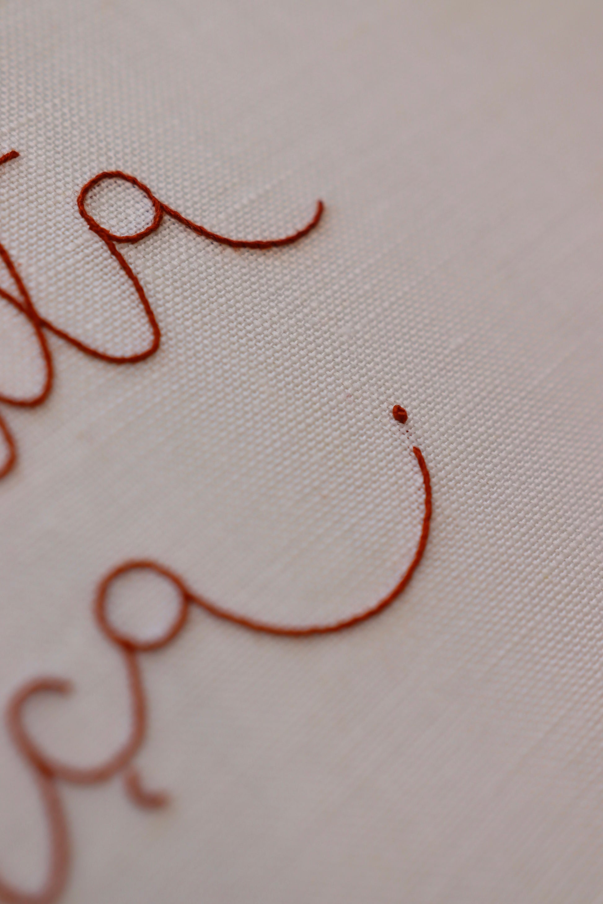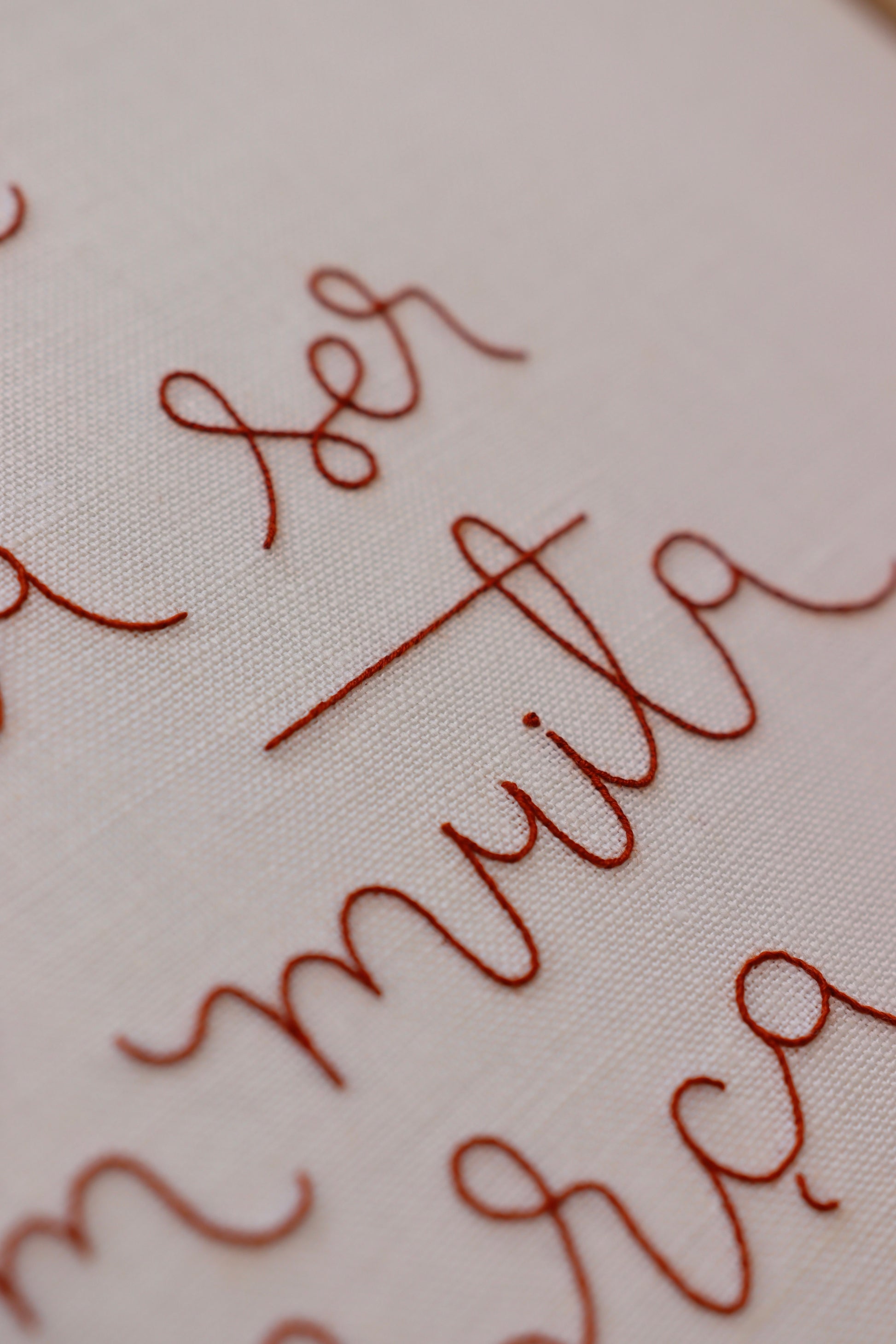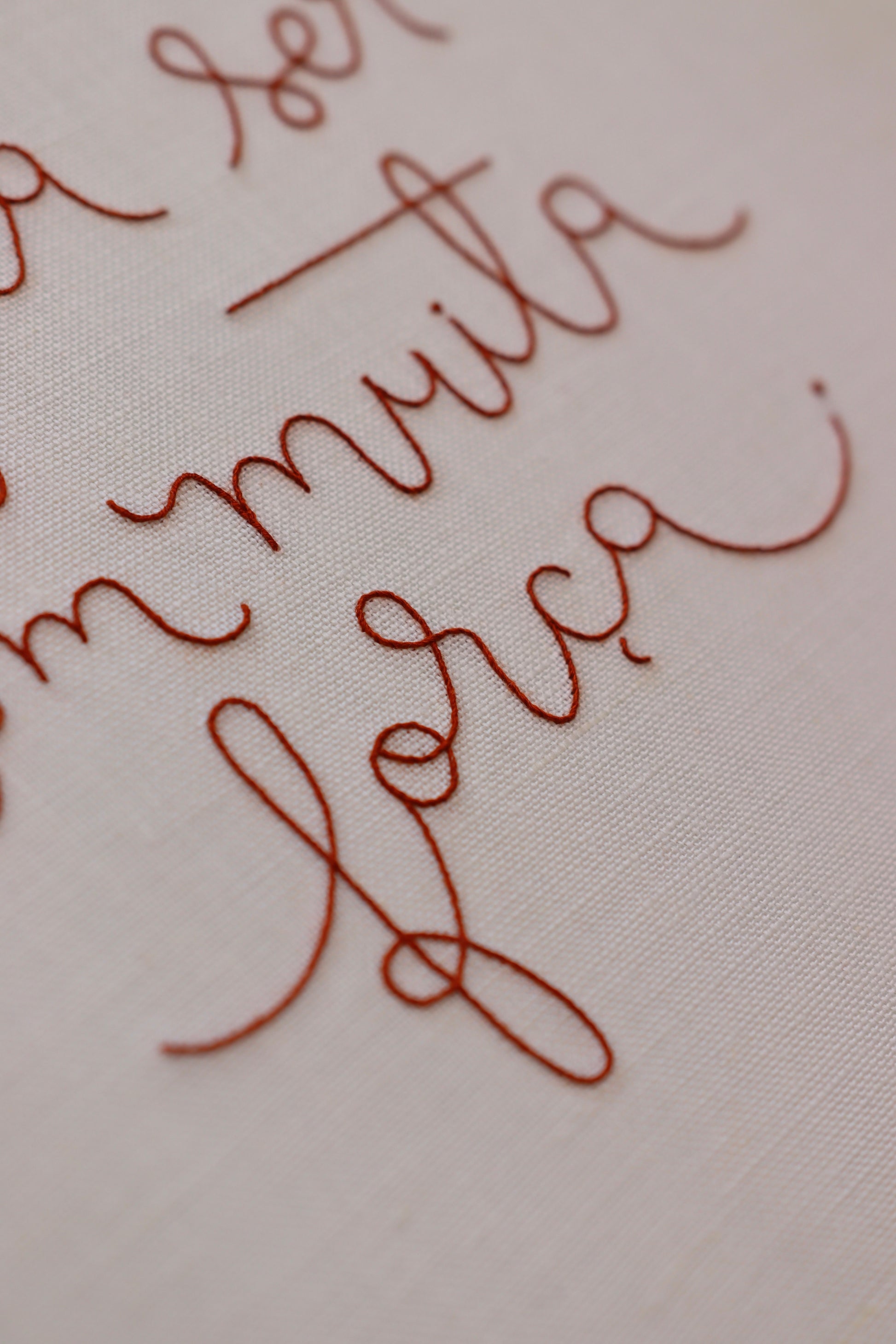 Quadro bordado à mão com a frase 'O que é pra ser tem muita força', com caligrafia exclusiva de Natália Marinho, utilizando linha francesa sobre tecido de linho puro.